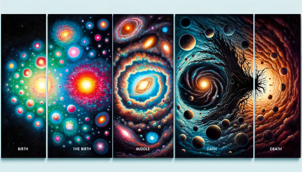 Create a picture/image of the birth of the universe and the middle and the death of the universe