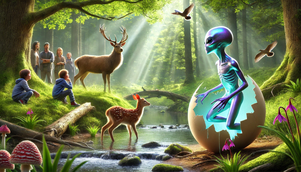 The encounter was interrupted by a rustling in the bushes. A group of children, who had been exploring the forest, stumbled upon the scene. They gasped in amazement at the sight before them – an alien, standing peacefully with a deer by the stream.