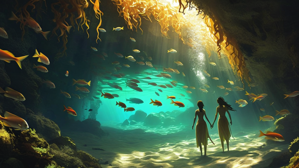 They started to swim towards the shimmering, mysterious cave that had been whispered about in legends for generations. The cave was said to be hidden beneath the surface of the crystal-clear lagoon, accessible only during the lowest tides. As they swam deeper, the water grew colder and darker, but their excitement only intensified.