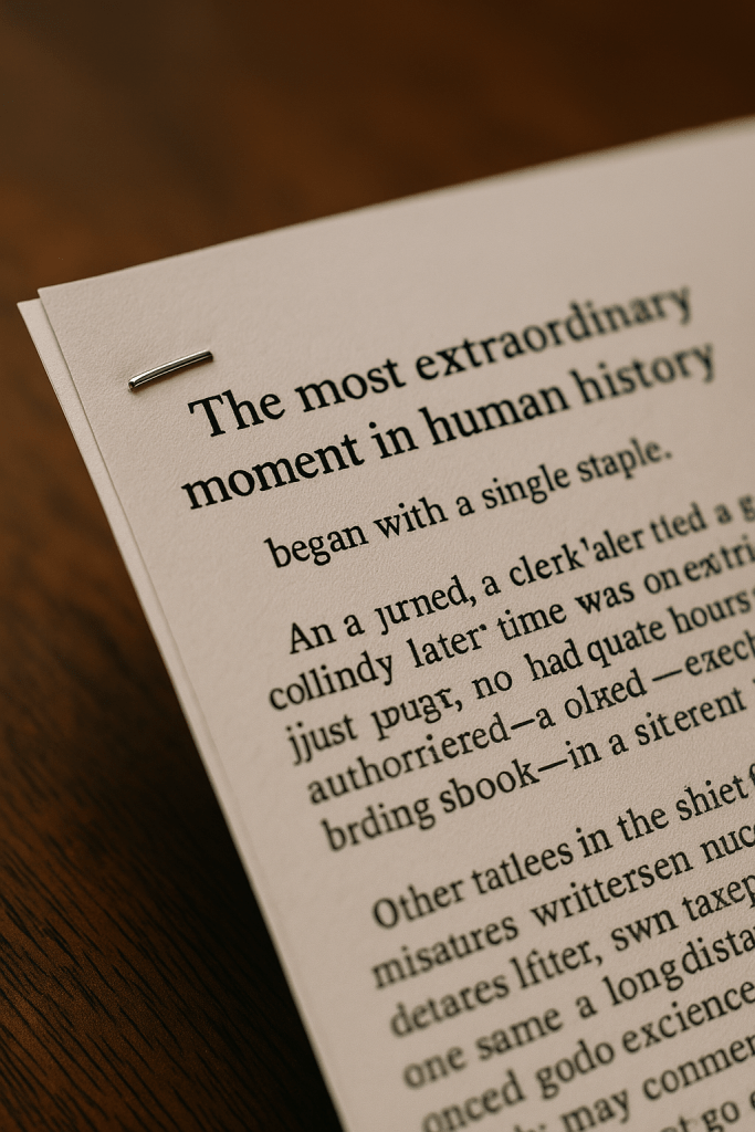 The most extraordinary moment in human history—a moment that would later be taught in every classroom, debated in every philosophy forum, and quietly whispered in awe beneath the stars—began with a single staple.